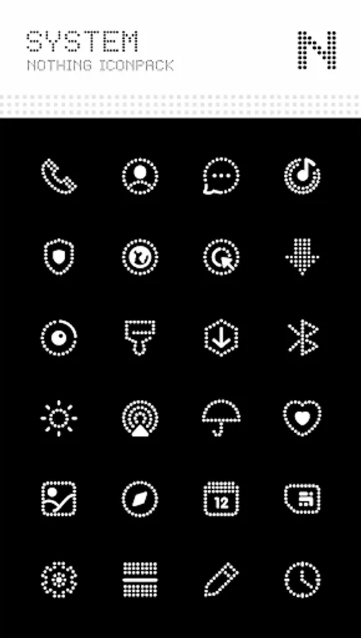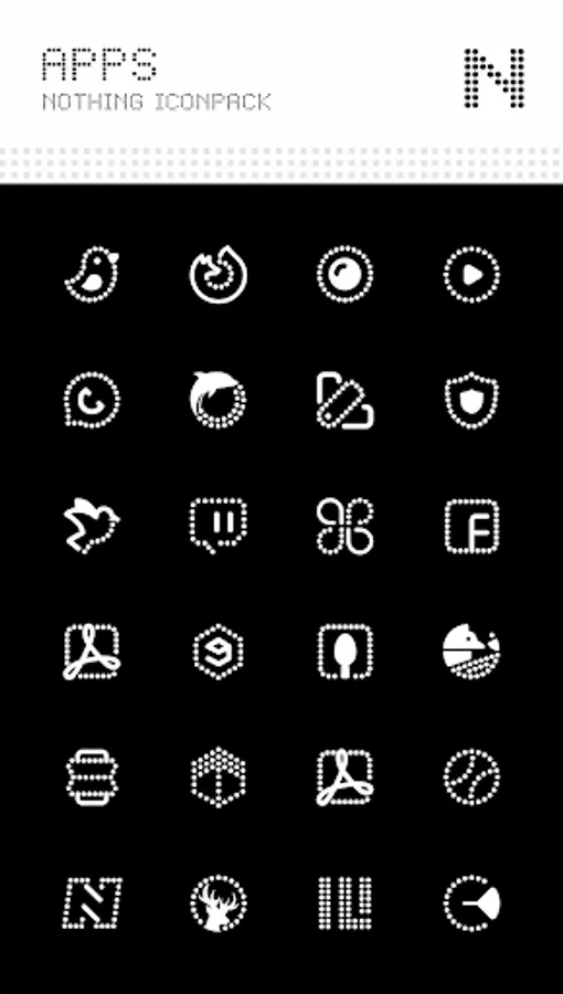 Nothing iconpack that delivers beautiful icons in combination with Dots Theme and White Color Depending on the original app icon. Primary Inspiration for this design is Nothing Brand.