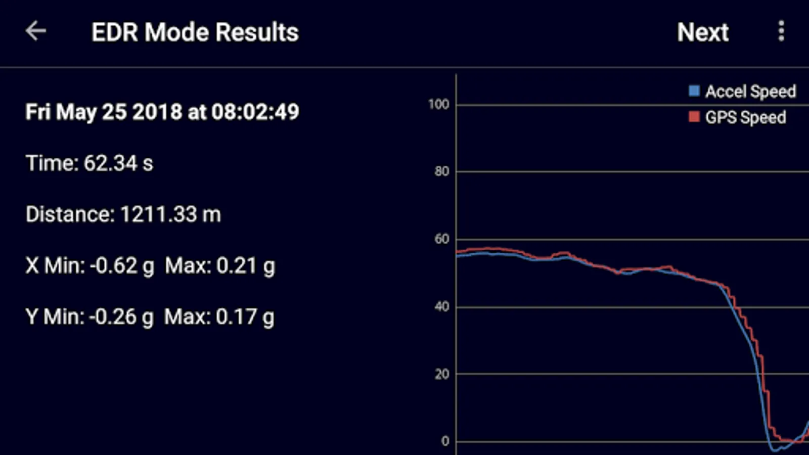 In addition to brake testing, 0-30 and 0-60 mph acceleration tests are available together with their metric equivalents. Standing ¼ mile acceleration, standing 400 m, 0-80 mph, 0-120 km/h tests, Event Data Recorder (EDR) and Crash test modes are also available in this version. EDR mode records the previous 60 seconds of data when the Record button is pressed. iAccel also has a continual recording mode which simply records the data to a CSV file received while the device is operating. To avoid running of of space, continuous recording is limited to 5 minutes. Crash mode is similar to Continuous recording except that all the auto-levelling features are completely disabled.