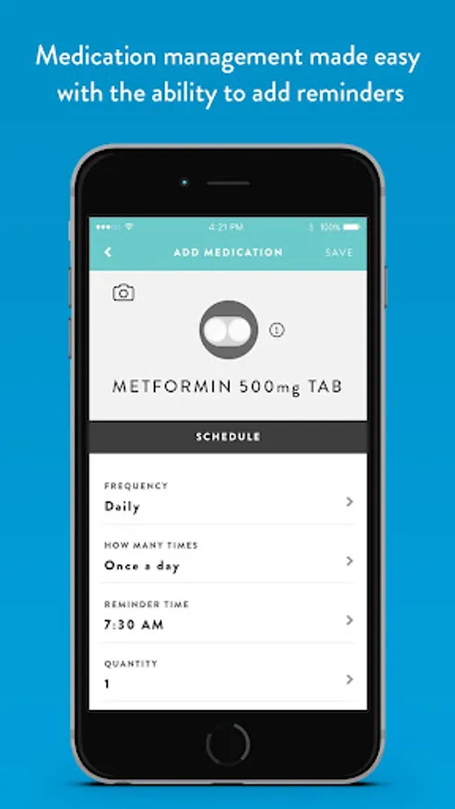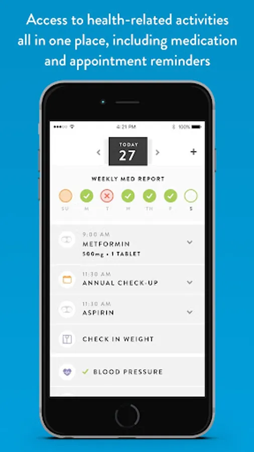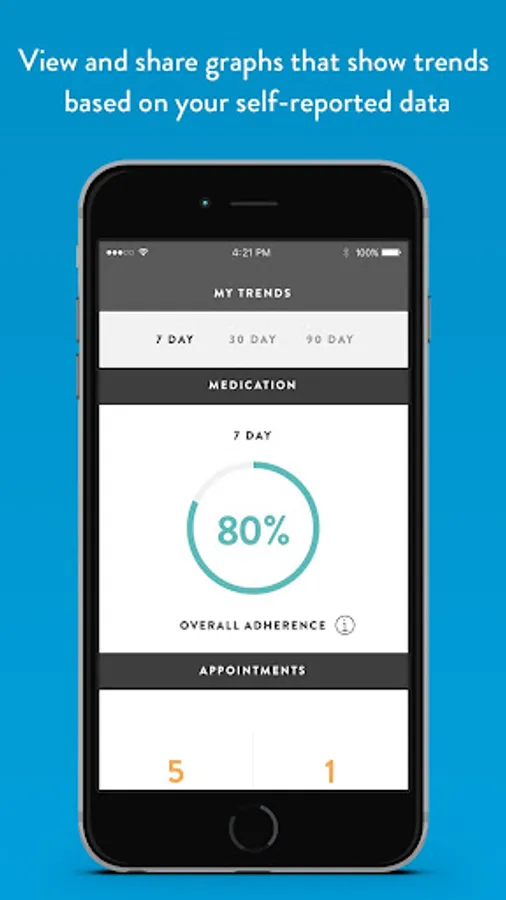 • Provides access to medications, appointments and self-directed adherence data and organizes it all in one place