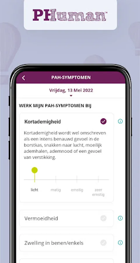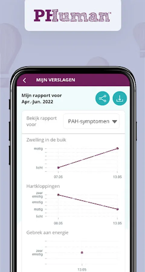 The app provides information that motivates you to find a modified lifestyle. PH Human generates high quality overviews that you can share with your healthcare provider.