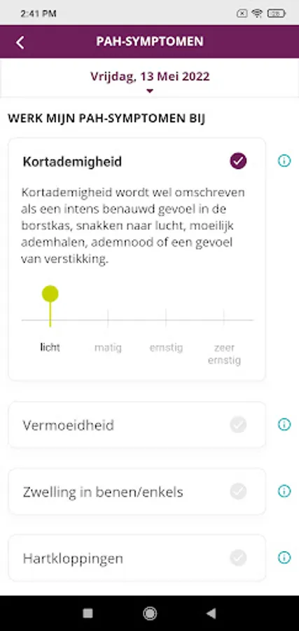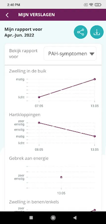 Record how you have felt between your appointments. Empower your healthcare team to better support and guide you by giving them access to accurate and regularly updated health data. By connecting to your PAH center you can share your data with your PAH specialist. You can also view or download your overviews yourself.