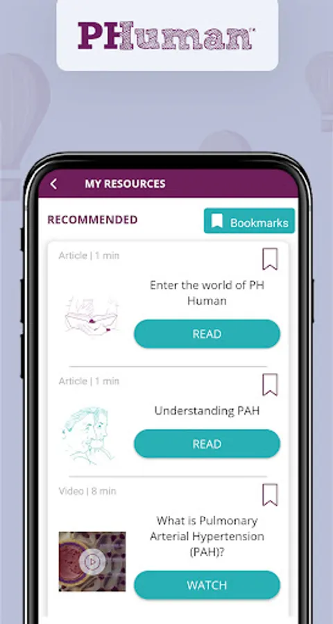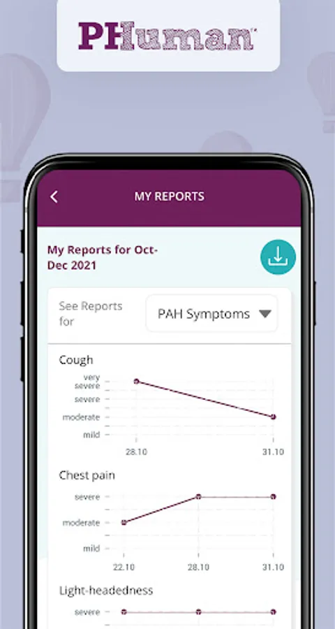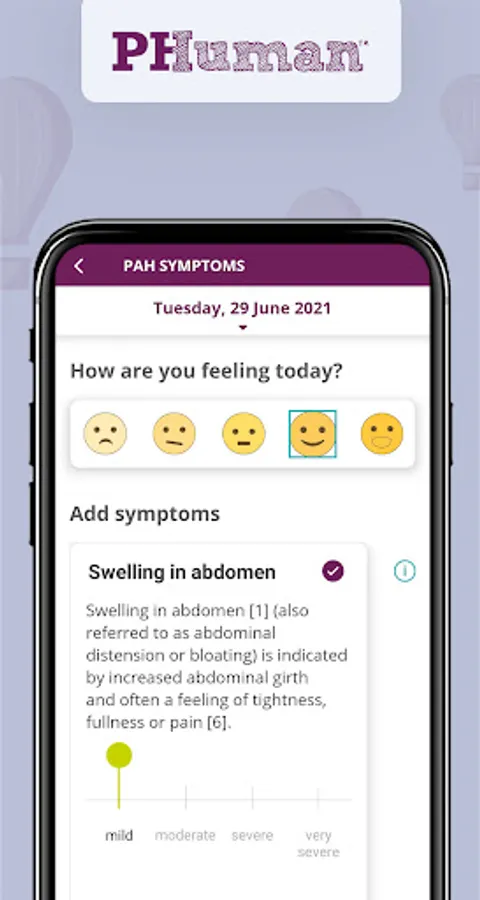 The PH Human™ App helps you to better manage your condition and supports you throughout your journey with Pulmonary Arterial Hypertension. You can track your symptoms and learn more about your disease, on the go. The app is a unique learning health system for PAH Management, helping you to stay informed.