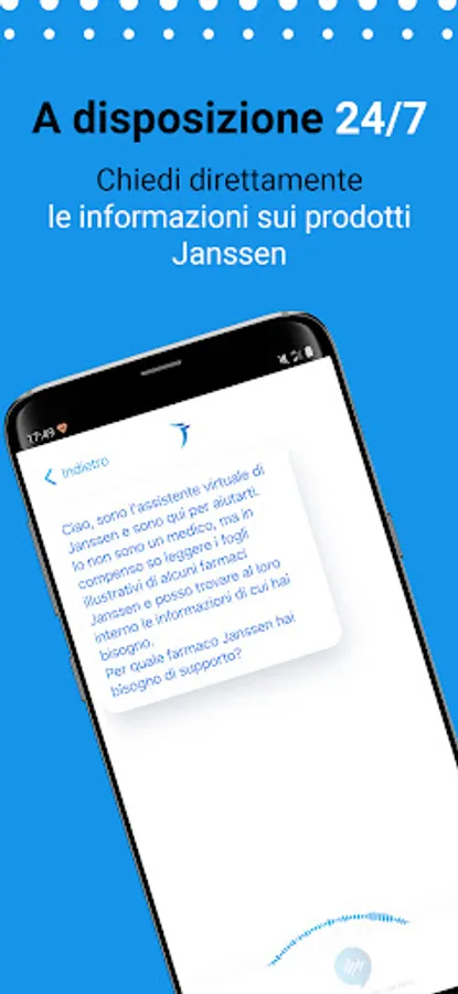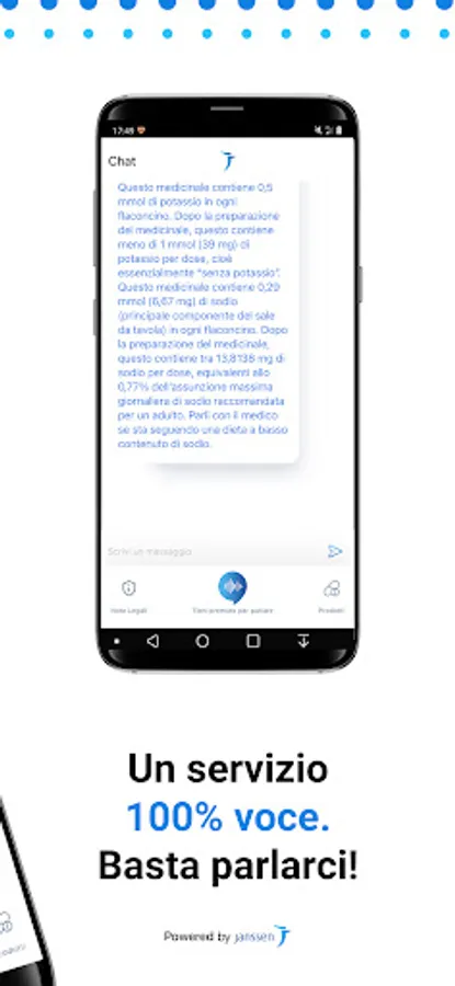 Tutte le informazioni, riportate nei fogli illustrativi di diversi farmaci Janssen, rese accessibili attraverso un'unica app. Grazie alla funzionalità di registrazione vocale, per accedere alle informazioni, ti basterà pronunciare il nome del farmaco e successivamente chiedere le informazioni presenti nel foglio illustrativo, come ad esempio: "Come si assume?" oppure "Quali sono le dosi consigliate?".