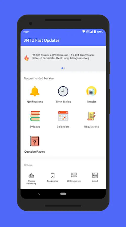 You can get all Universities Latest Notifications, Results updates, time tables, syllabus books, previous question papers, materials, Hall tickets/Admit card, Job updates, academic calendars, SGPA/CGPA percentage Calculator and regulations etc from JNTU FAST Updates App.