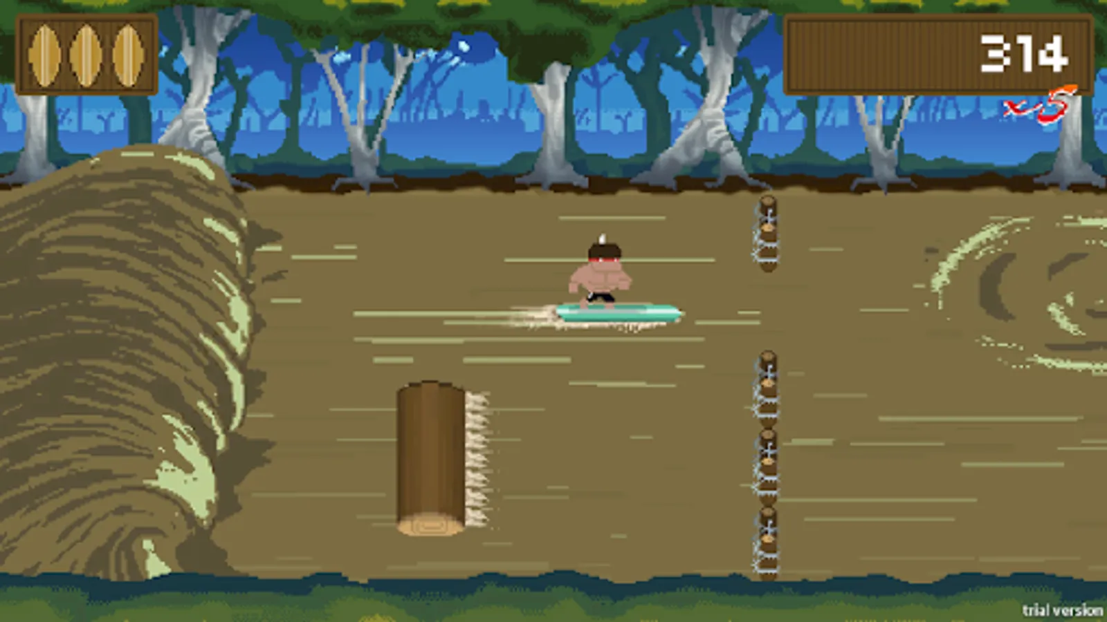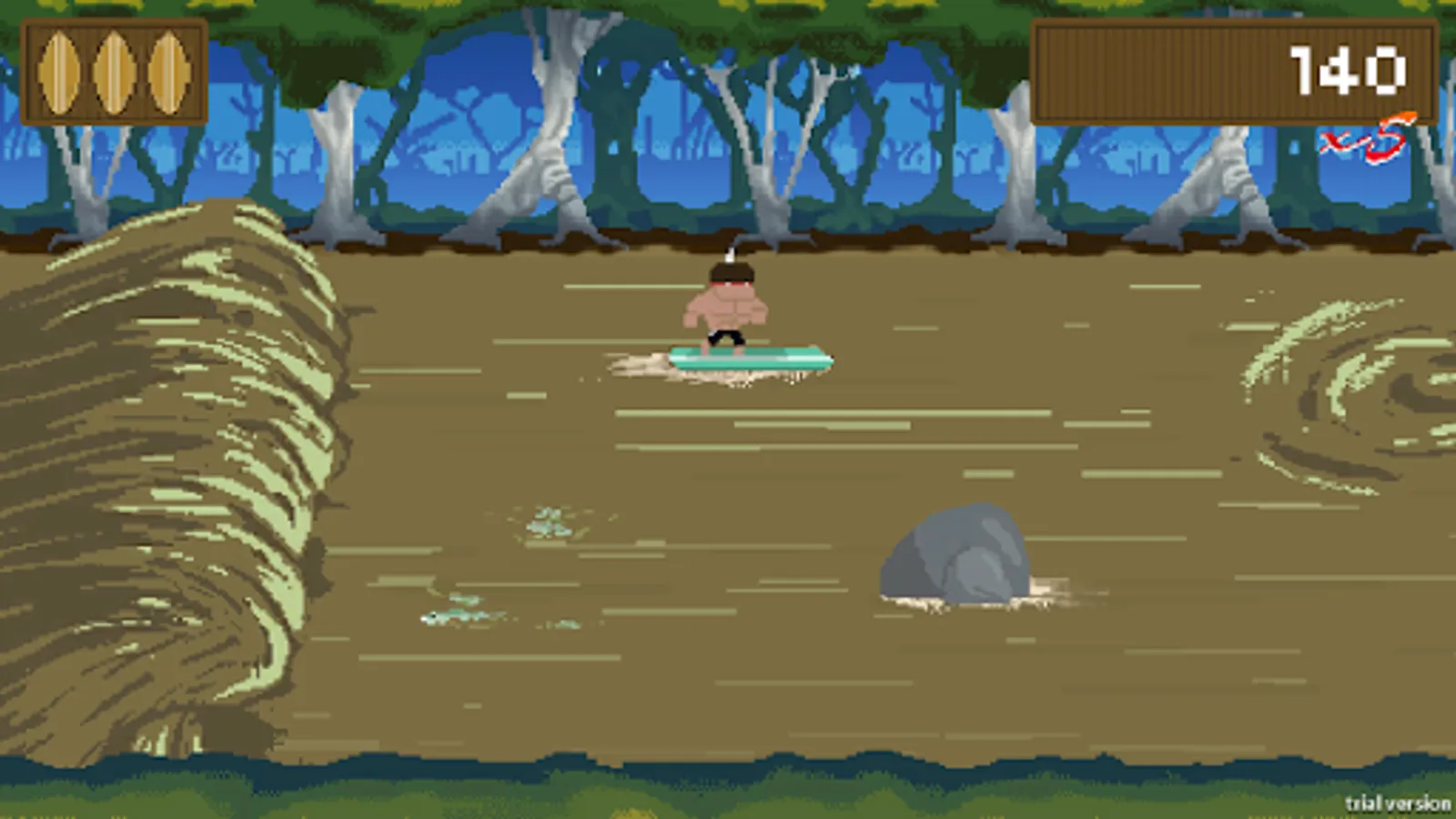 Control an Indian surfing the Pororoca phenomenon and realizes the differential of each indian's "rebirth" after every fall in the river.