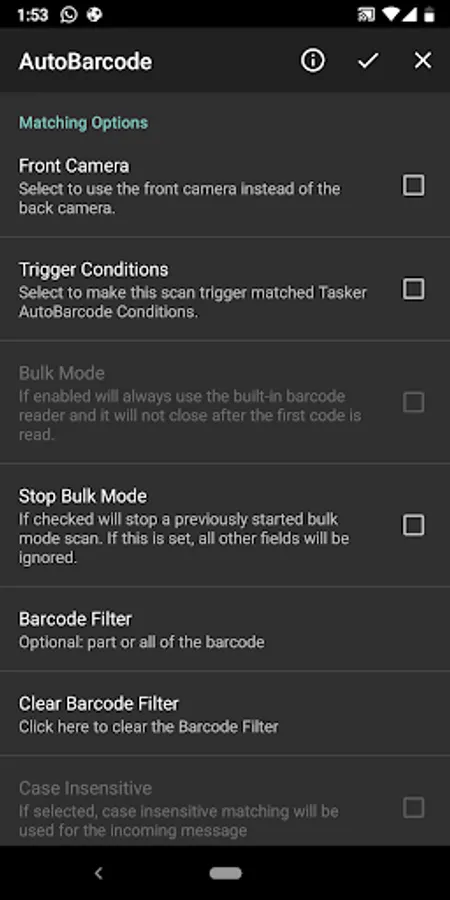 With AutoBarcode you have advanced matching options and even a flexible command system (see how it works here: http://goo.gl/PRQas) that allows you to truly personalize your experience.