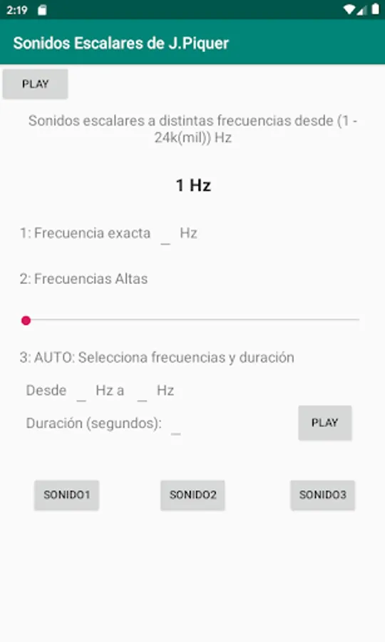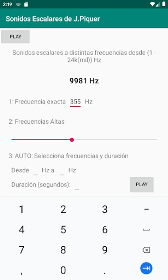 2- listen to a beep at a certain frequency that ranges from 1hz to 24000hz Select where it puts Auto, and set the range of frequencies to be heard, for example from 432hz to 500hz and select the listening time in seconds, Every 300 seconds are 5 minutes, 10 minutes is 600 seconds, 15 minutes is 900 seconds etc.