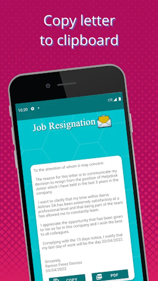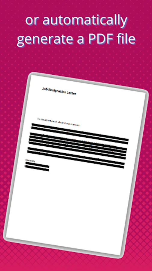 With our application you can finally write a letter of resignation, totally formal and cordial, to say goodbye to your current job, easier than ever! You just fill in the fields we ask for, and it will be generated automatically. What are you waiting for to download the application?