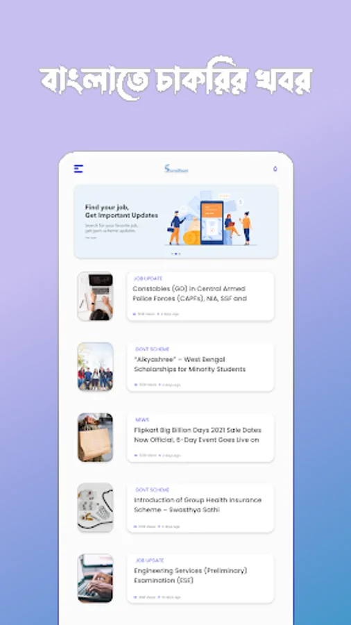 Sondhan is one of the best user-friendly, lightweight, and online apps for all the job seekers who want to get suitable Government & Private Jobs all over India. It provides all the job updates using notifications regular basis in English or Bengali language. And here You can get all the latest Current Affairs videos by which Anyone can easily prepare Himself for their Competitive Exam Study (Like Rail, Army, Navy, PSC, UPSC, NET, SET, WBCS, WBSSC, TET, CTET, DSSSB, UPTET, GATE, IIT JAM, CLAT, UPPSC, MPSC, WBPSC, AP Police, TNPSC, CGL, Group C, Group D, IAS, IPS, IRS, IFS, JAM, CLAT, JEE, SSC(CGL, CPO, CHSL, JHT, Selection Posts, GD, JE, Stenographer), RRB(Group D, ALP, JE, NTPC), State TET, NDA, CDS, AFCAT, GATE, NEET, CAPF, INET, RBI Assistant, IBPS(PO, Clerk, SO), SBI( PO, Clerk, Specialist Officers), RBI Grade B, LIC Assistant, NABARD, Indian Bank PO, LIC HFL, etc.).