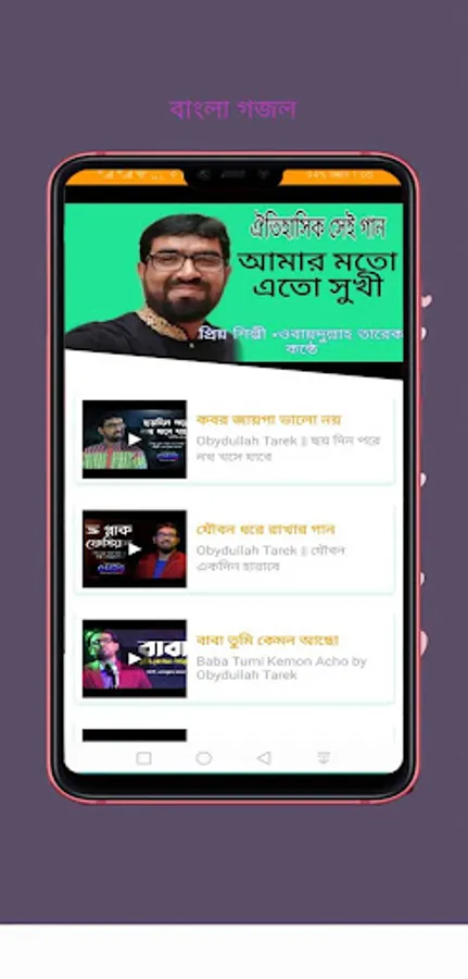 My app is arranged with selected popular islamic ghazals. Ghazals have been given by popular singers such as Roknujaman, Obaidullah Tarek, Sadman Sadek and many others.