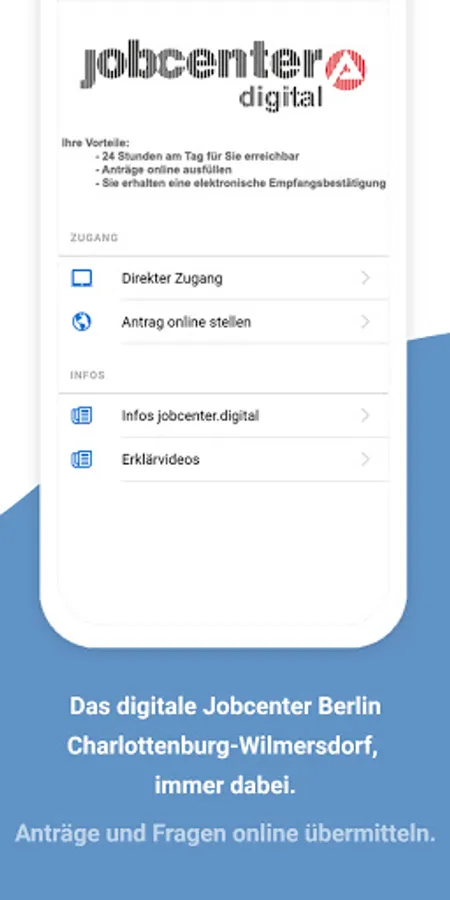 Welcome to the Berlin Charlottenburg-Wilmersdorf job center. With our job center app, we are just a tap away, whenever you need us.