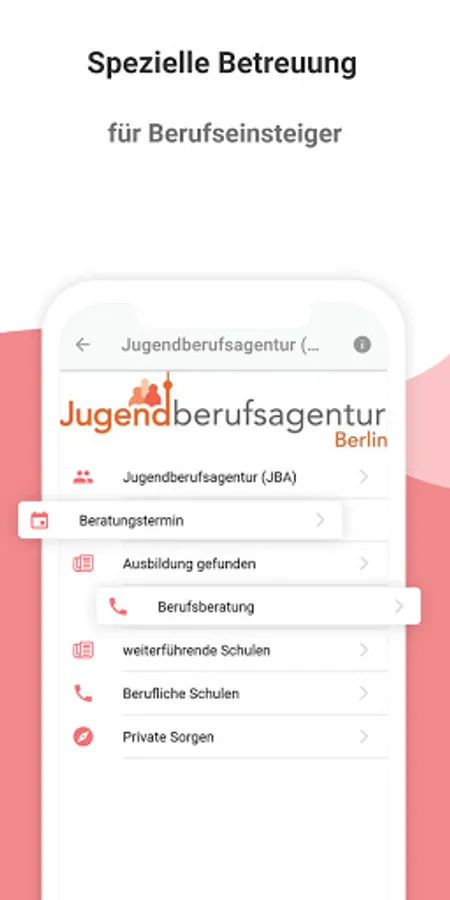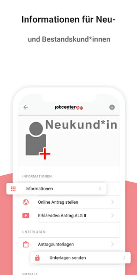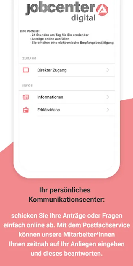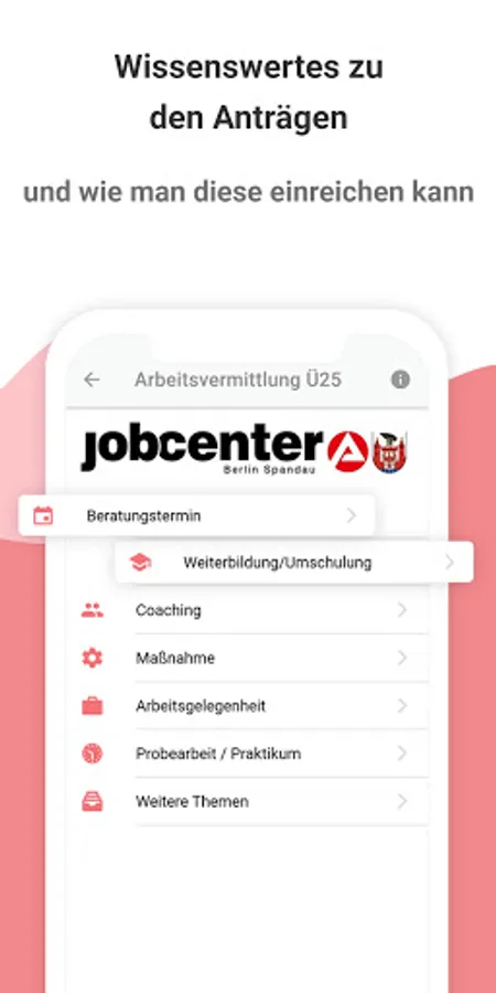The digital job center Berlin Spandau in mobile phone format. Find all the information that will help you with your job search quickly and easily. These are: