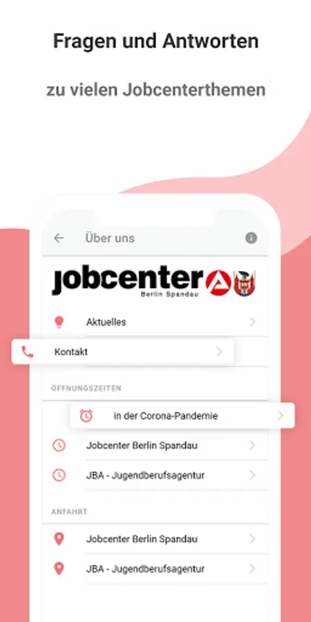 In the contact module we have stored all the important telephone numbers, email addresses and addresses of our job portals for you. You don't have to look far for it! Do you have any questions or suggestions? The team of the Jobcenter Berlin Spandau App looks forward to your message. You can reach us at jobcenter-berlin-spandau@jobcenter-ge.de.