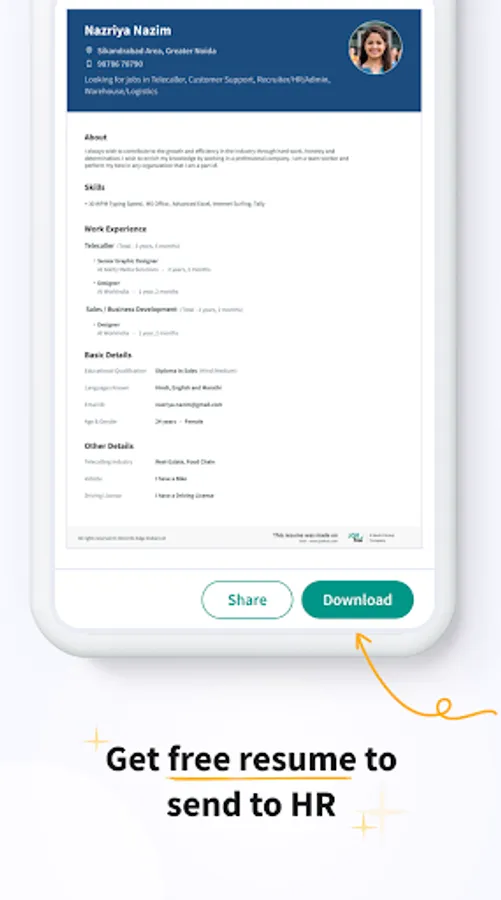 With Job hai Resume Maker or Resume Builder, you can create your professional Resume by sharing important details like name, age, qualification, experience, etc. You can download the Resume & share it with HR to get higher salary jobs.