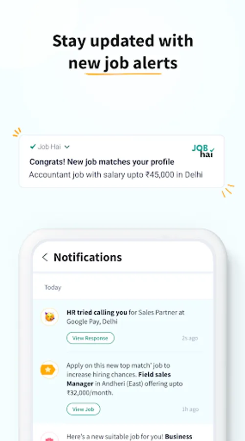 Download Job Hai, the best job search app to find part time jobs, full time jobs, work from home jobs, fresher jobs in India. Apply jobs for 10th pass, 12th pass jobs, graduate jobs from different categories like data entry jobs, driver jobs, content writer jobs, security guard jobs, online work, accountant jobs, teacher jobs, graphic/web designer jobs, it jobs, telecaller jobs, sales marketing jobs, delivery jobs, housekeeping jobs and other jobs in Delhi NCR, Mumbai, Hyderabad, Pune, Bangalore, Chennai, Kolkata, Ahmedabad, Jaipur, Chandigarh, Lucknow, Indore, Surat, Patna, Bhopal, Visakhapatnam (Vizag) & Kochi.