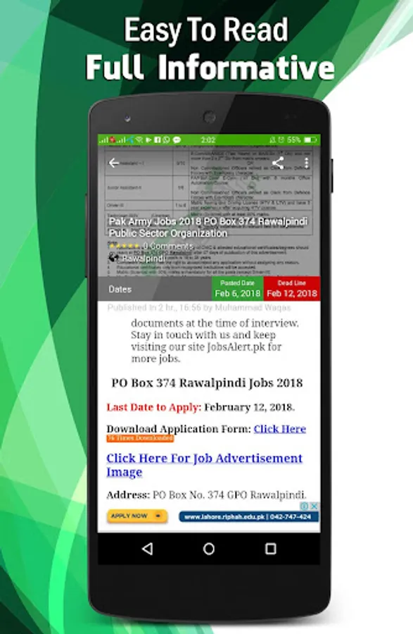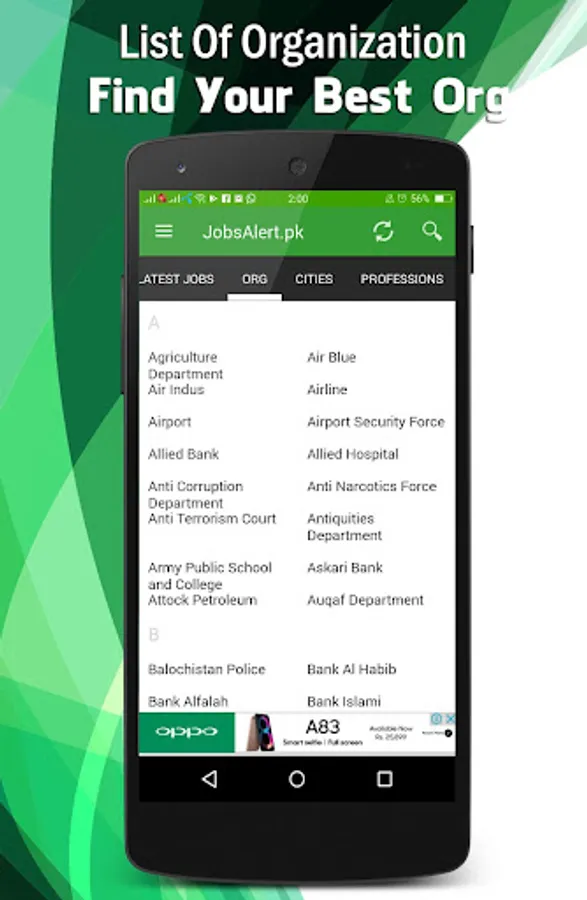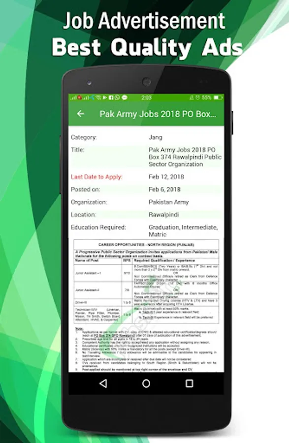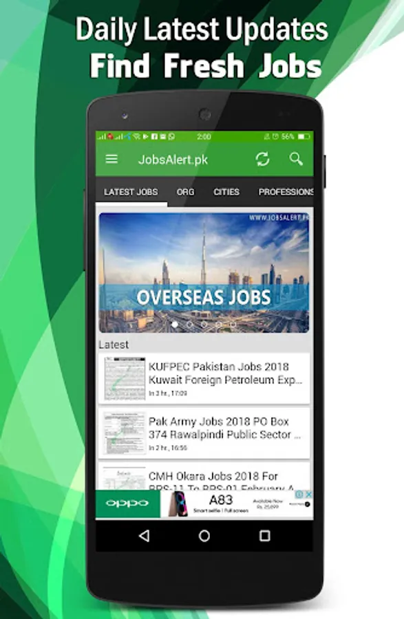 JobsAlert will provide you the high quality jobs in Pakistan from all Pakistan Newspapers of Express, Dawn, The News, The Nation, Nawaiwaqt and Jang. Best part is that you will get jobs notifications of Army, NTS, PPSC, FPSC, Government, Federal, Navy, Air Force, Private, Wapda, Police and lots more. Also you will get jobs by cities, which are mostly famous Lahore, Karachi, Islamabad, Peshawar and other cities as well.