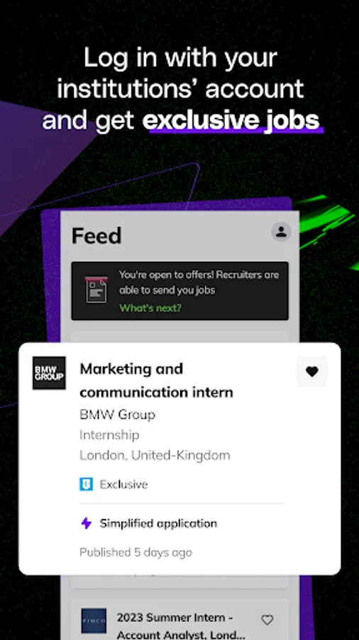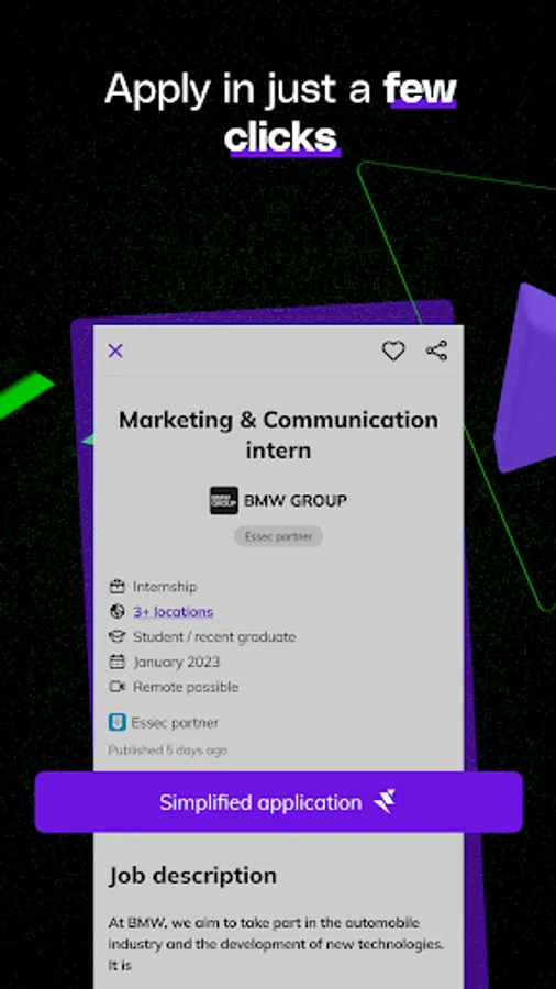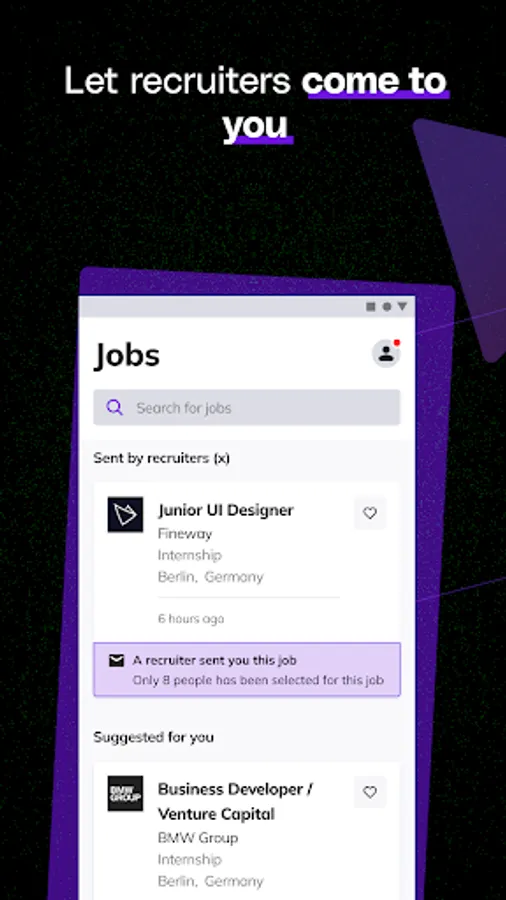 Find your dream job on the JobTeaser app dedicated to students, and let recruiters come to you! With our 4,000+ partnered recruiters (among which BWN, Henkel, Zalando, Amazon, Deutsche Bahn to name a few…) it doesn’t matter if you are looking for an internship during your studies or a full time job right after you graduate: JobTeaser has your back.