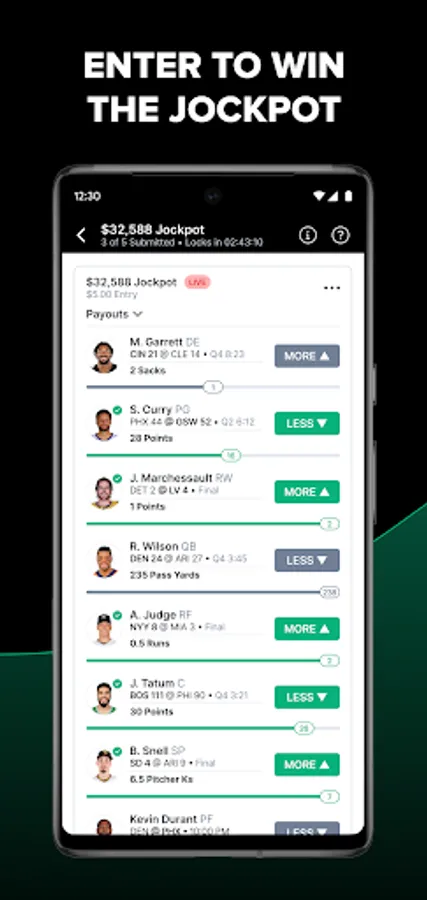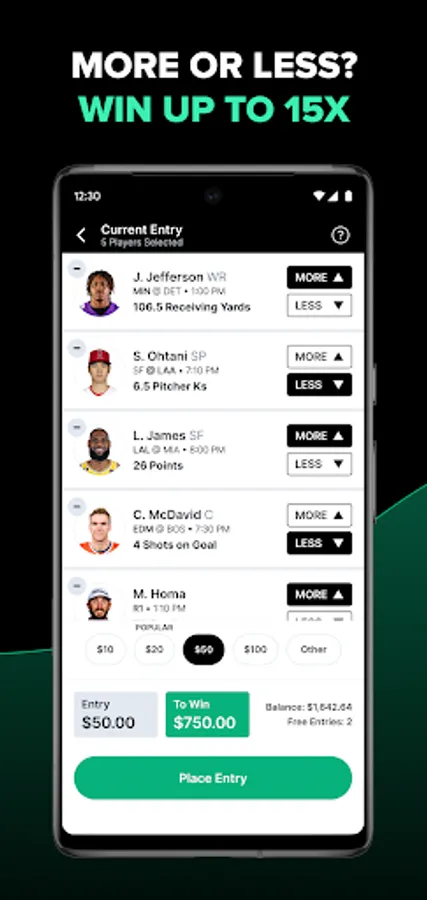 Combine & Win: Choose two to five different stat projections and select “More” or “Less” than each player’s predicted outcome. Make accurate over/under picks and win big! The more winning picks you make, the larger the real money payout - up to 15X! Also, you can enter mixed-sport slips with players from any available sport. Countless combinations and winning possibilities!