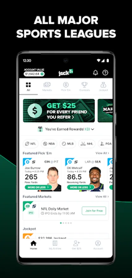 Jock MKT is your go-to Daily Fantasy Sports (DFS) app featuring Pick ’Em and Cash Markets in NFL, NBA, MLB, PGA, NHL, NASCAR, LoL, CS:GO, Tennis, and More! Experience the thrill of predicting player outcomes and performance to win real money prizes every day. Watch your favorite sports and teams like never before!