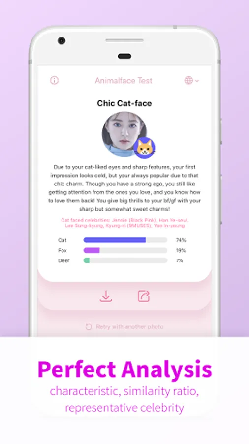 An AI will look at a picture of your face, tell you what kind of animal you look like, and let you know your personality and characteristics. Also, find out which K-Pop stars got the same results as you! No membership registration required, and the photo data is never transmitted anywhere.