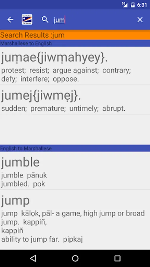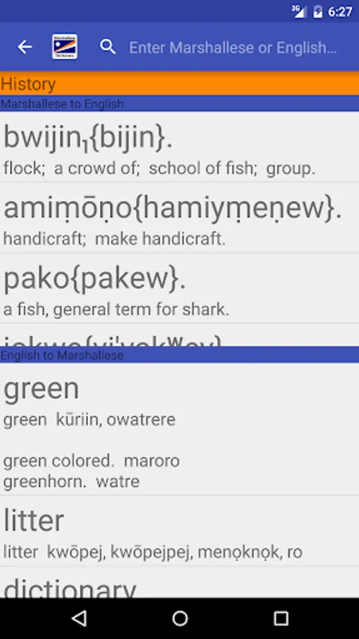 It also has a history function which enables you to quickly see the words you searched recently, and could help with learning Marshallese or English.