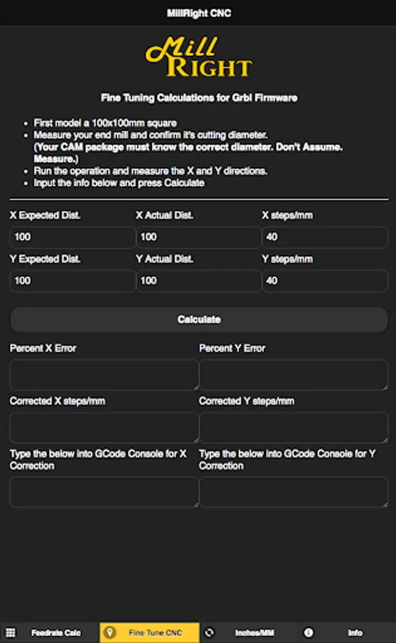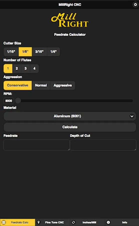 Feedrate Calculator for MillRight CNC M3 and Carve King CNC Machines. Alsco contains an inches/mm convertor and a calculator to fine tune your CNC machine.