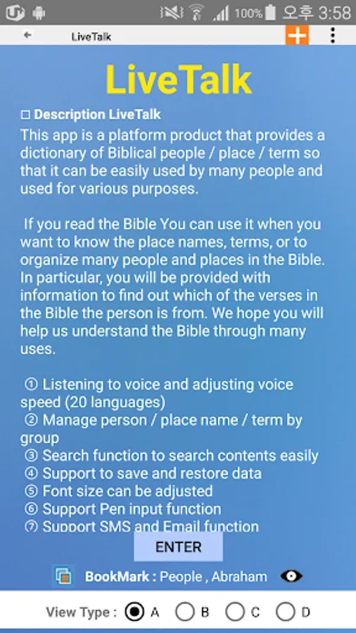 This app is a platform product that provides a dictionary of Biblical people / place / term so that it can be easily used by many people and used for various purposes.