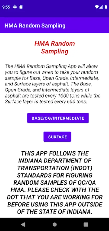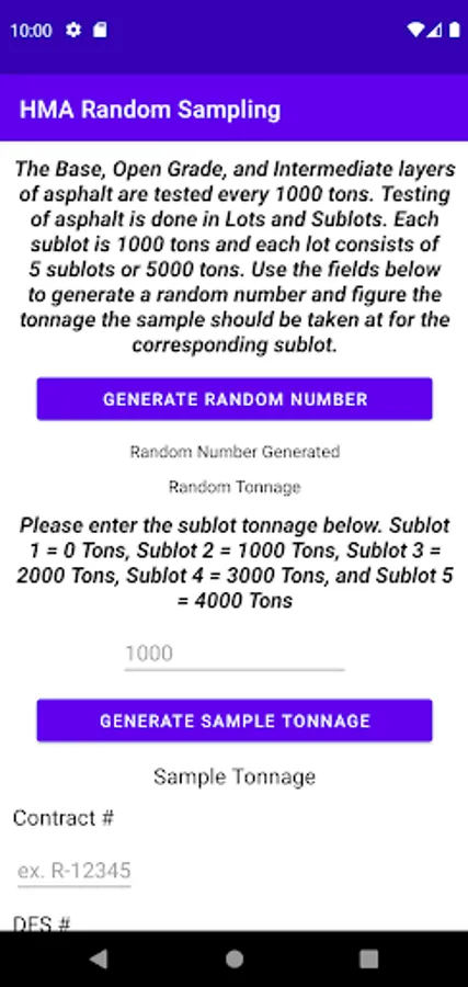 This app will allow you to calculate when to take asphalt samples based on a random number for the Lot/Sublot that you are currently needing to test and then send the results for records keeping.