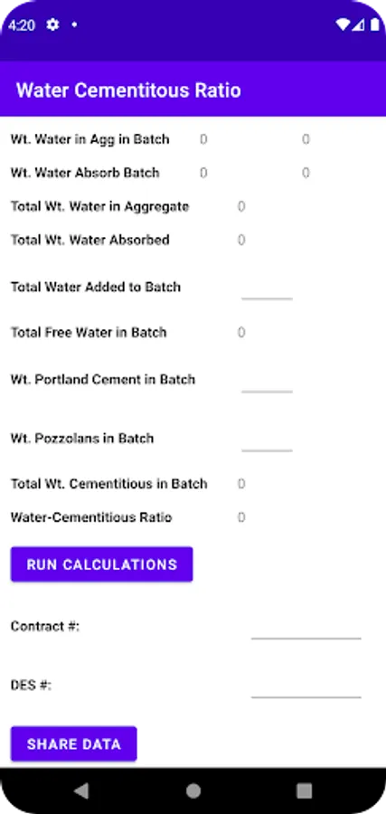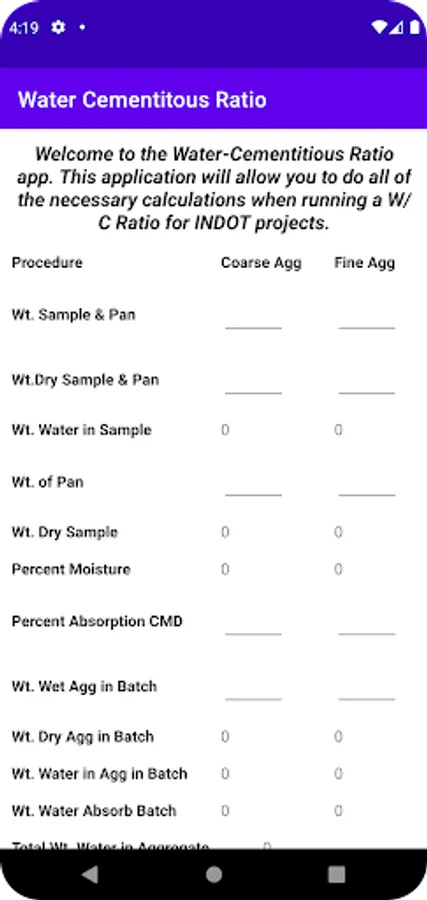 This application will allow you to do all of the necessary calculations when running a W/C Ratio for INDOT projects.