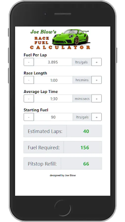 Take out the guesswork in working out your fuel needed for races! Race Fuel Calculator is designed to quickly calculate the amount of fuel required for a race, along with how much fuel to add at the pitstop if needed. It will show you total laps, including the final lap after the time runs out. The results are updated dynamically as you input your data, without need for a submit button.