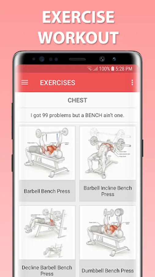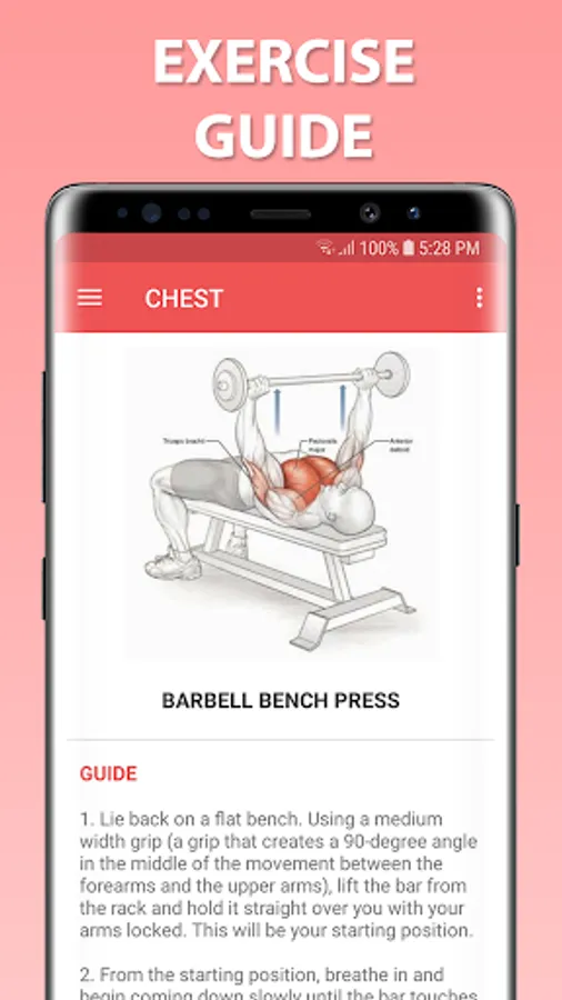 More than 100 different exercises to do at the gym with images and an explanation of the exercise. This is your personal instructor for training major muscle groups such as Chest, Shoulders, Biceps, Triceps, Abdominals, Back and Legs.