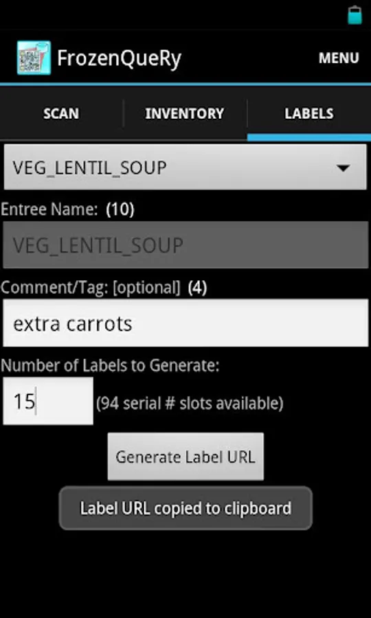 -In-App Label Generator Assistant to assemble a direct URL to our web-based FrozenQueRy Label Generator Utility to automatically create labels with formulated serial number ranges that hop over serial numbers already in use in inventory. The URL is conveniently copied into your phone's clipboard for you to paste into email or text file for retrieval on your printer connected computer.