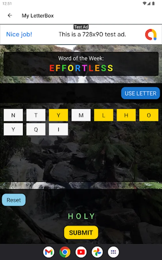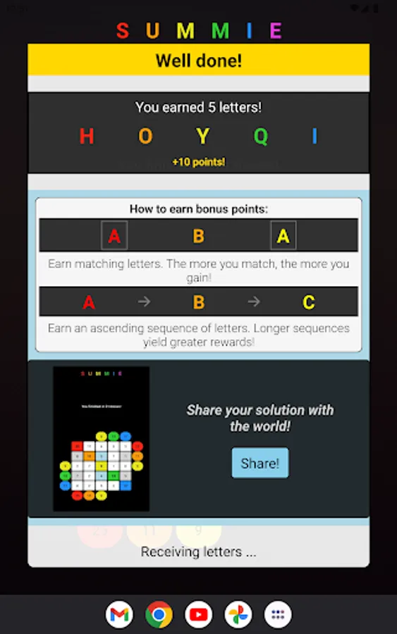 Each week, Summie users race against time to accumulate a certain number of points. Users solve puzzles to gain letters, piece together the letters to form words, and then submit the words to earn points! You are also rewarded for earning particular sequences of letters, adding an element of luck to the game that ensures the weekly deadline is always within reach!