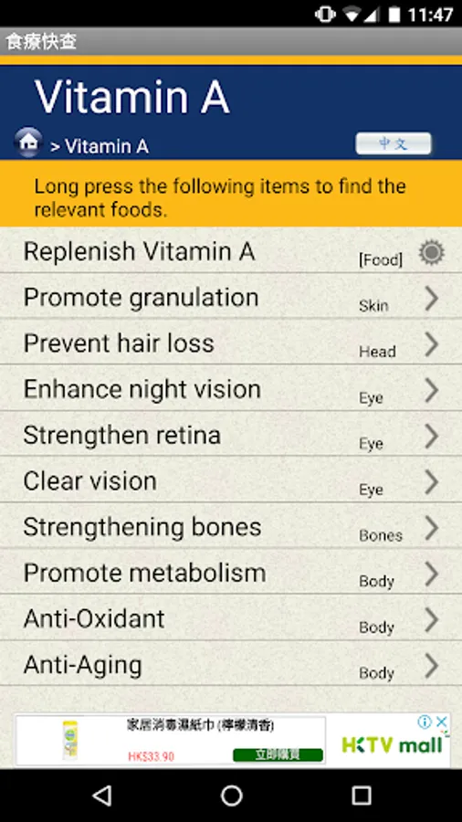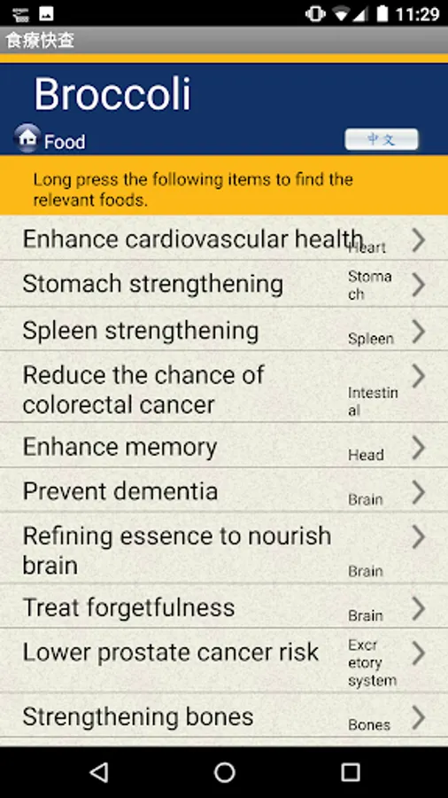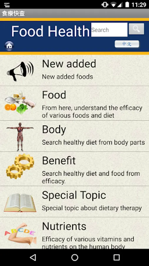 Quick and easy way to know the benefit and nutrition from different kinds of food. You can also find what foods help what parts of our body. Moreover, you can easily to find the relevant food therapy.