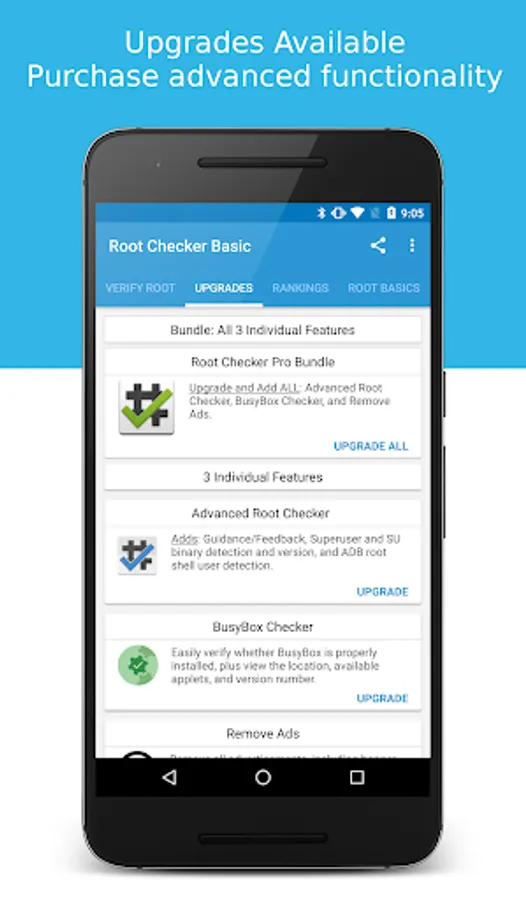 This application will test the device for root (superuser) access using a very simple, quick, and reliable method that has been successful for over 50 million Android devices. The su binary is the most common binary used on Android devices to grant and manage root (superuser) access. Root Checker will check and verify that the su binary is located in a common standard location on the device. In addition, Root Checker will verify whether the su binary is properly functioning in granting root (superuser) access.