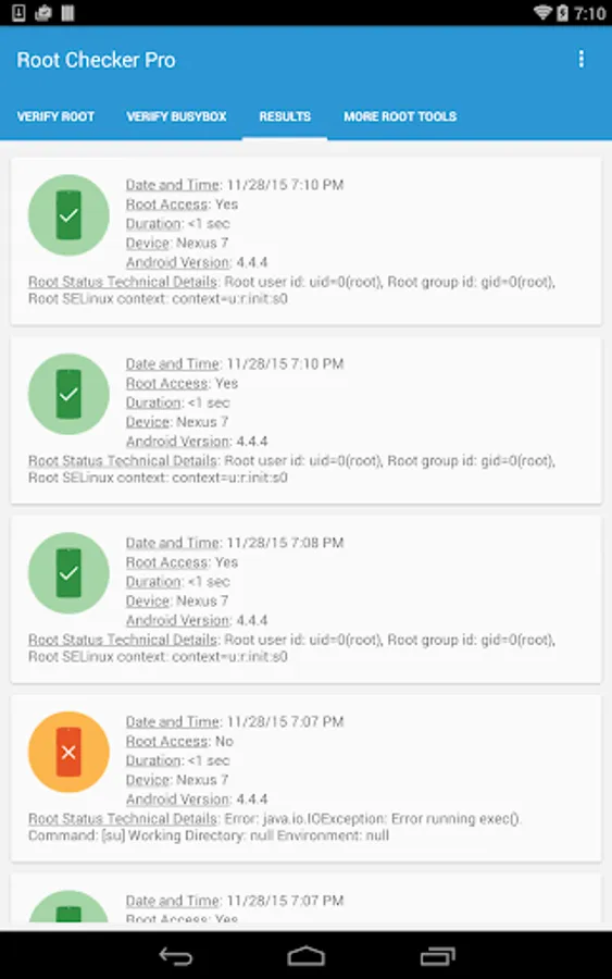 The goal of this application is to provide even the newest Android user with a simple method to check their device for root access. This application will also allow the user to verify a proper BusyBox installation.