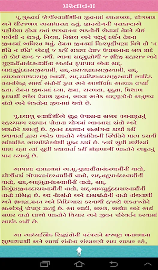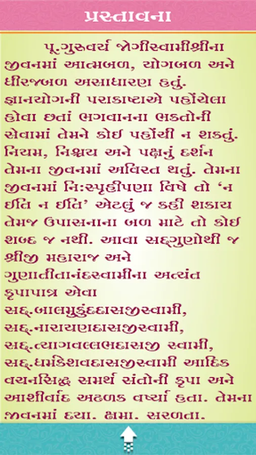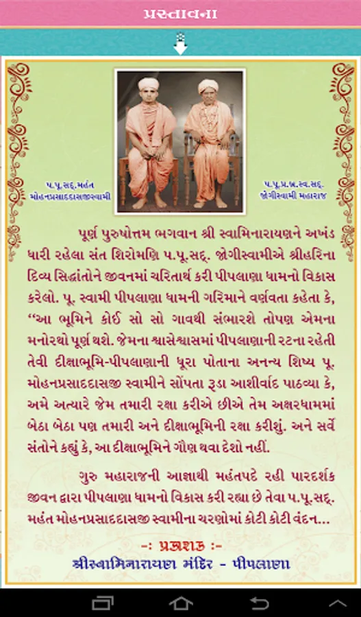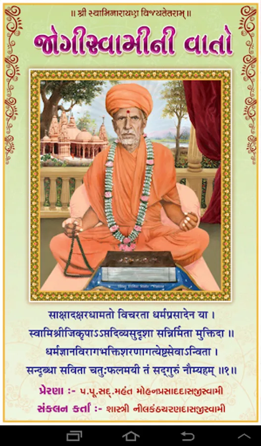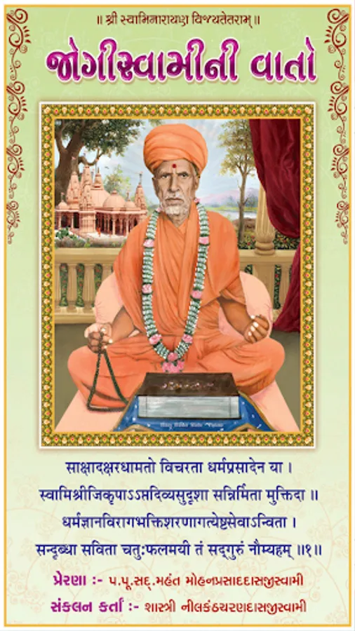 Param Pujya Sadguruvarya Jogi Swami Dharmaprasaddasji Swami was a great saint. He was a true worshipper of supreme God, shri Swaminarayan Bhagwan who is the source all incarnations & controller of innumerable universes. Jogi Swami has nicely delivered the nectar of the best scripture “Vachanamrut” to innumerable people and has inspired & led them to the path of salvation. In an effort to free self from the obligations, with the pious inspirations from the chairman of satsang sabha param bhakt muktraj shri Panara Jethabapa, param pujya sadguru shashtri shri Balkrishnadasji had commenced writing the talks of Jogi Swami on the tenth day of first half of Vaisakh month of Samvat Year of 2031. With the concentrated mind remaining in the state of divineness he has accomplished this task of writing this book till fourth day of Aaso month of Samvat year 2038. Without the grace of the god along with the blessings of the Guru Jogi Swami and the devotees of the God it is impossible to compile this book containing the talks as it is given by Jogi Swami. The original manuscripts of this scripture are very well preserved by Param Pujya Sadguru Mahant Shri Mohanprasaddasji Swami who is greatly blessed by Pujya Jogi Swami. He has given the true virture of hospitality. He has gracefully given understanding of true religious tenets and was frequently reminding the religious principles of Guru Maharaj Jogi Swami. He has kept this path of worshipping completely pure & pious. At the beginning of writing this book I express my total reverence to both these Sadgurus.
