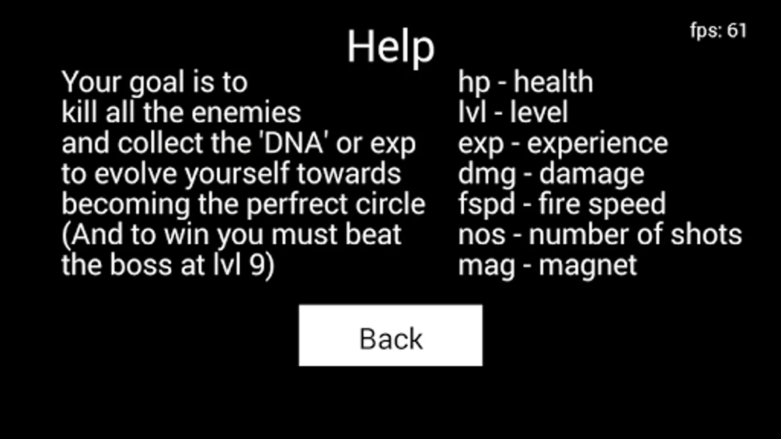 Your goal is to kill all the enemies and pick up the "DNA" or experience to evolve/level up to become the perfect circle and if you are good enough you will face the boss.