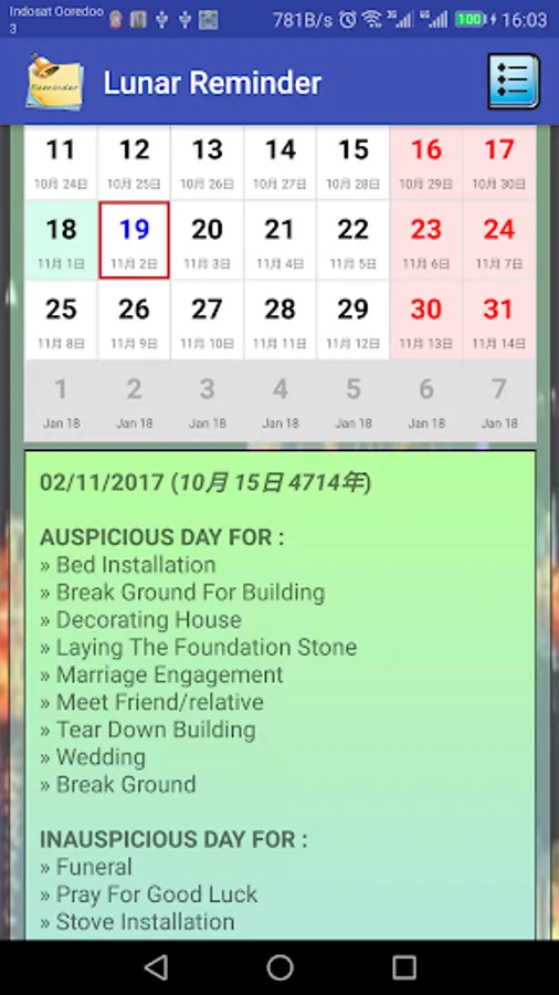 Showing Auspicious Days (Lucky Days), Inauspicious Days (Unlucky Days) and Auspicious Time (Lucky Time) on picked date in the main calendar