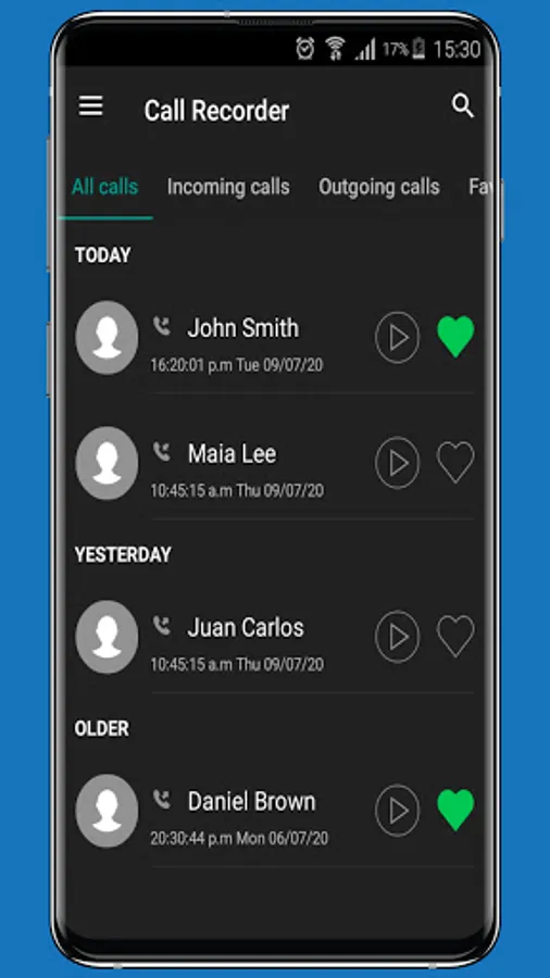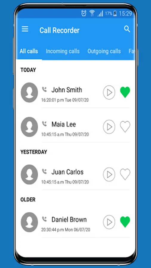 - Organize your call records. You can see calls as all calls records, only incoming, only outgoing, date and time easily.