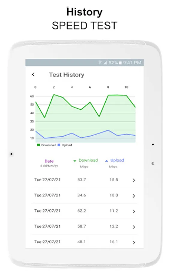 ★ Detailed speed test information and Real-time graphs show connection consistency.