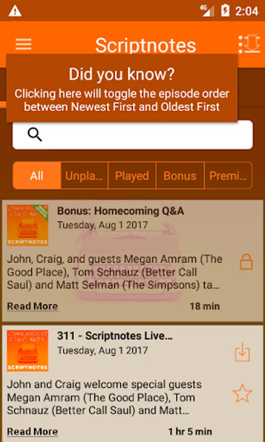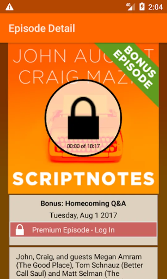 Stream episodes anywhere with the official Scriptnotes app for Android. Listen to recent episodes for free, complete with show notes, episode links, Three Page Challenge entries and more.