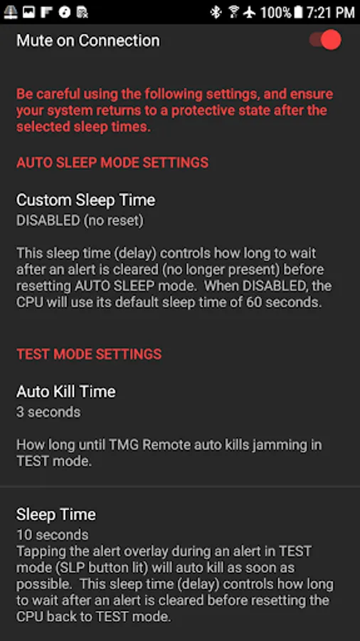 TMG Remote also provides options for audio alerts to your car radio or headset, auto JTK in Test mode, and auto reset of Auto Sleep mode.