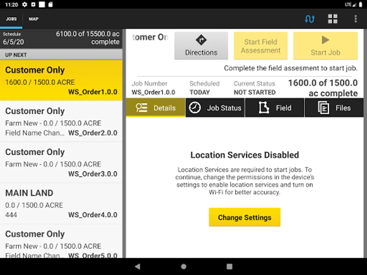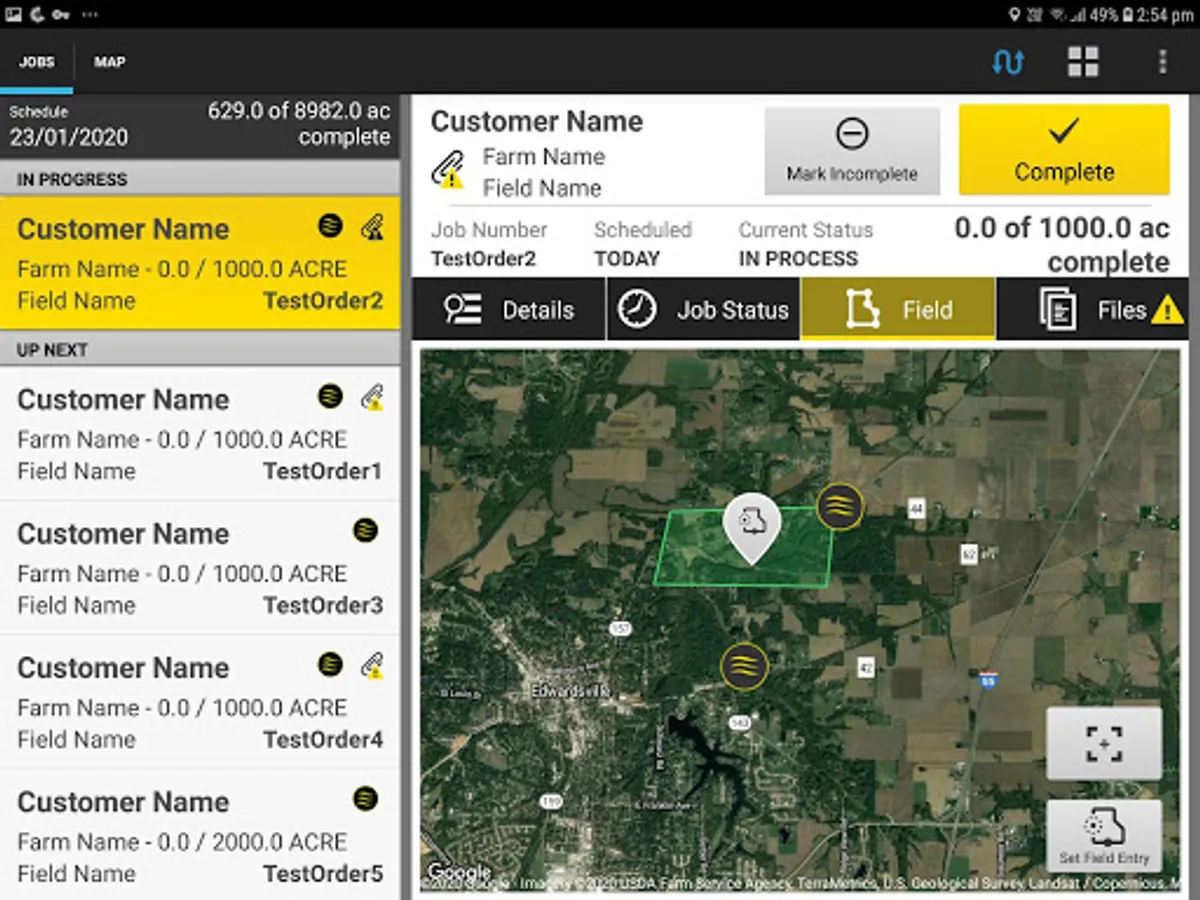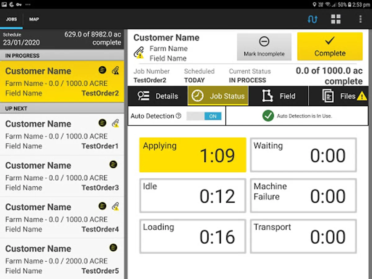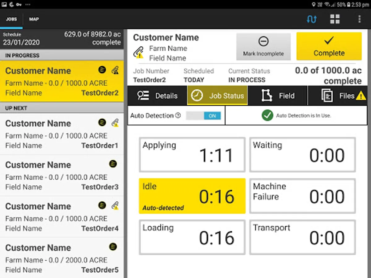 Operators can also log time in appropriate categories to allow analysis of individual machine performance as well as the efficiency of the entire fleet. When the work order is complete, the mobile device will auto-record the number of acres done on the work order. Additionally, an operator may also record up to 55 conditions covering the following eight categories: