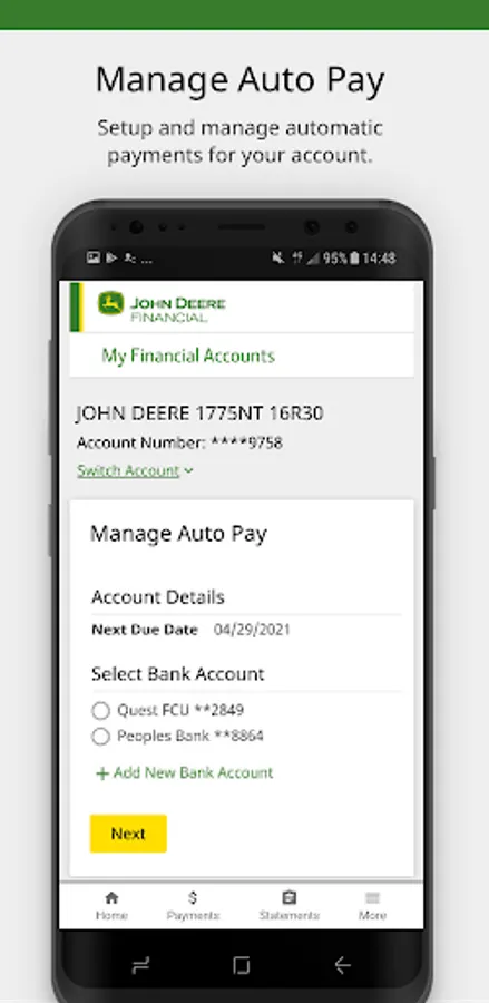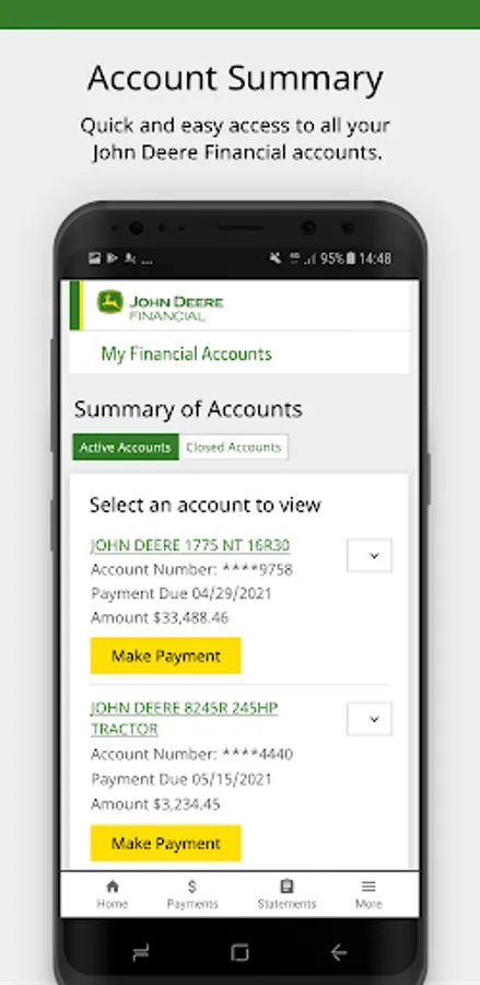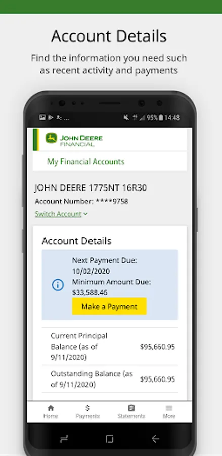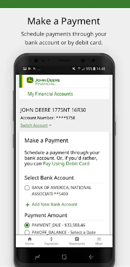 Official app for John Deere Financial Account Management. View your account details and your statement, make a payment, and enroll in AutoPay. Convenient. Secure. Simple. Account Management on the go.