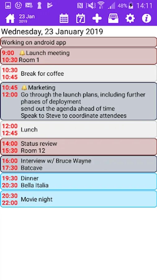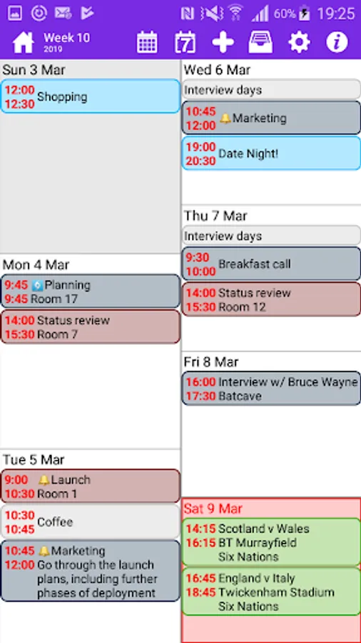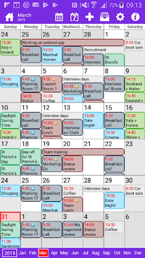 Fully compatible with your synced calendars such as Google Calendar and Gmail, Exchange and Outlook, or event your own local calendars. PowerCal will display all of these events and offers several fully customisable views, including: