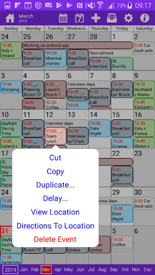◦◦ Event long tap menu including cut, copy duplicate and delay options