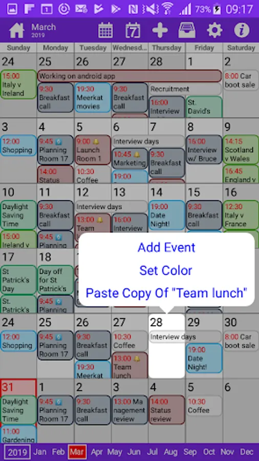 ◦◦ Day long tap menu including options to paste cut or copied events and to add new events