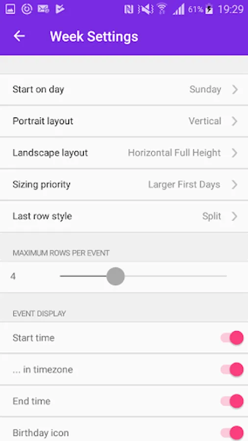 • Maximum number of lines to display per event (useful to limit the display of events with long notes)