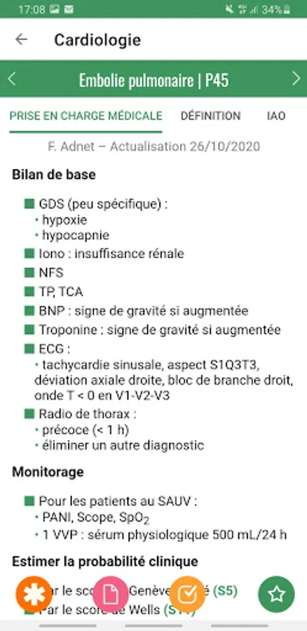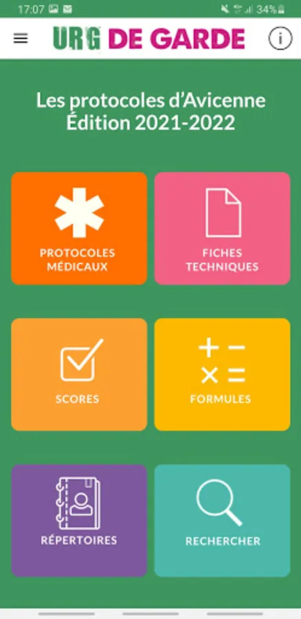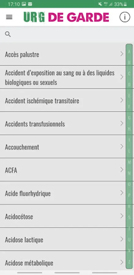 - 160 protocols classified in alphabetical order within their specialty or accessible by a "Search" button. These synthetic protocols allow, at a glance, optimal care in the context of an emergency.